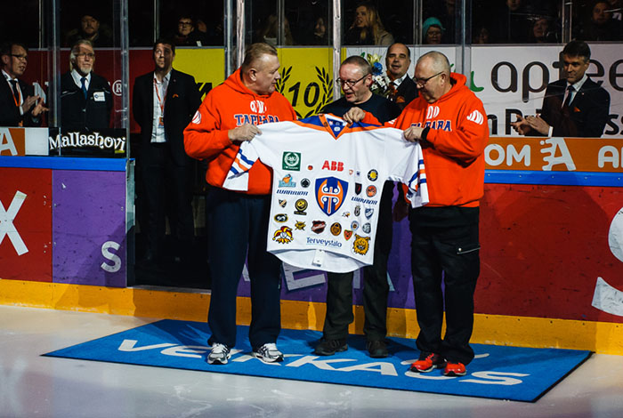 Huoltajalegendoista legendaarisin Jarmo ”Pämi” Männistö lopetti vuonna 1968 alkaneen jääkiekkouransa vuonna 2016. Yhteensä työuraa Tapparassa kertyi 42 vuotta, kun mies välillä käväisi rauhanturvahommissa Lähi-Idässä. SM-mitaleita Tapparassa kertyi peräti 19, niistä kultaisia kahdeksan. Viimeisen kerran Pämi nähtiin huoltohommissa Sorsapuiston ulkoilmaottelussa joulukuun puolivälissä. Eläkkeelle mies potkittiin vuodenvaihteessa ottelussa Kärppiä vastaan. Kuvassa pitkäaikaiset työtoverit Vellu Pohjonen ja Jorke Pekkanen lahjoittavat Pämille muistopaidan, johon on kiinnitetty kaikkien niiden pääsarjajoukkueiden logot, joita vastaan Pämi ehti töitä tehdä.