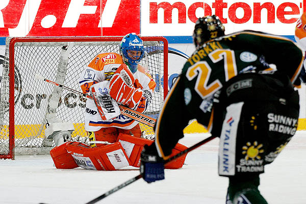 Mika Lehto nousi kaudella 2007-08 SM-liigan kaikkien aikojen eniten nollapelejä pelanneeksi maalivahdiksi – kauden jälkeen niitä oli koossa jo 36. Hän pelasi kyseisellä kaudellakin seitsemän nollapeliä, joista kolmas tarkoitti Nicklas Bäckströmin ohittamista nollapelitilastossa. Kauden seitsemästä nollasta peräti kolme tuli peräkkäisissä peleissä Ilvestä vastaan. Yhteensä Lehto piti Ilveksen maaleitta kauden aikana 218 minuuttia ja 50 sekuntia putkeen. Kuvassa turhaan yrittää Sami Torkki.