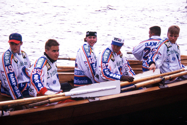 Loppukesällä 1995 Tappara haki yhteishenkeä kirkkoveneilläkin, joita kiskottiin pitkin Pyhäjärveä niin, että vesi vain roiskui. Valkopaitaisten joukkueessa tässä valmiina Derek Mayer (19), Ilpo Kauhanen (35), Timo Nurmberg (12), Arto Kulmala (27), Markus Oijennus ja Jarkko Nikander (22).