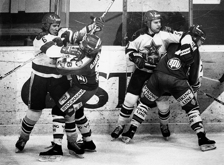 Moskovan ZSKA oli liian vahva vastustaja Tapparalle 1970- ja 1980-luvuilla, kun ne kohtasivat toisiaan Euroopan Cupin peleissä vähän väliä. Kuvassa joukkueet kohtaavat vuonna 1987, ja moninkertaiset maailmanmestarit Aleksei Kasatonov (6) ja Vladimir Krutov (9) kamppailevat vähemmän maailmanmestaruuksia voittaneiden Janne Ojasen (8) ja Timo Jutilan (7) kanssa.