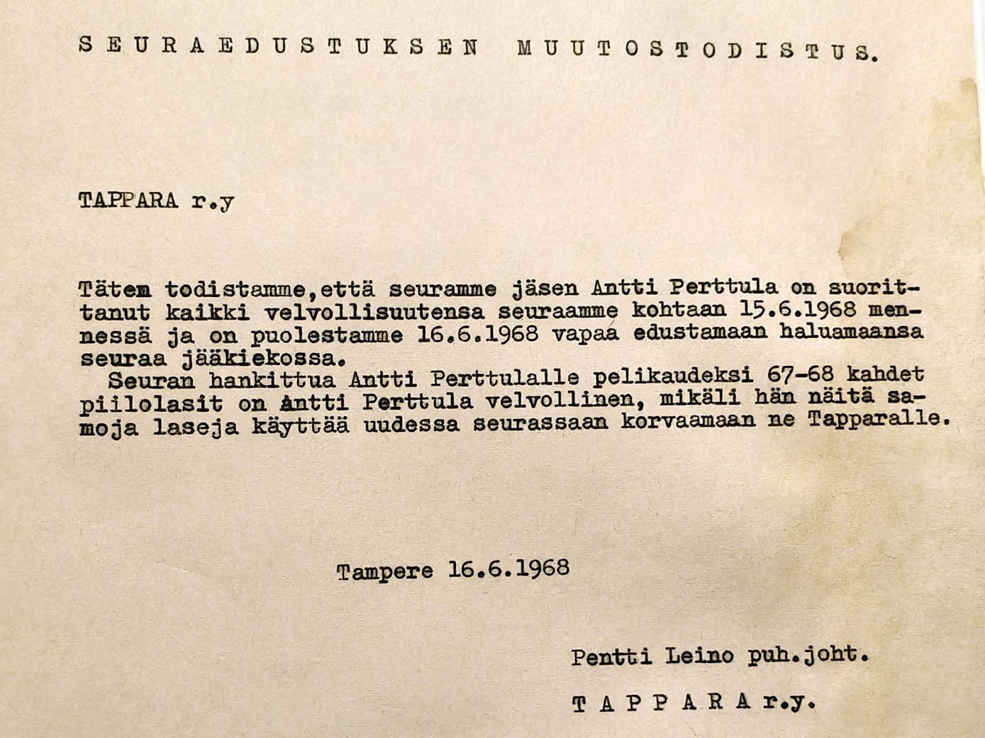 Puolustaja Antti Perttula puolestaan opiskeli Helsingissä ja pelasikin siellä, kunnes palasi kirvesrintoihin kaudeksi 1967-68 Töölön Vesasta. Koska Vesa päästi Perttulan kirvesrintoihin vapaasti ilman karanteenia, Tappara sitoutui myös päästämään hänet vapaasti muualle, mikäli hän joskus siirtoa haluaisi. Jo vuotta ja yhtä Tappara-kautta myöhemmin oli edessä paluu Helsinkiin jatkamaan matematiikan erityisopintoja. Vesa oli siinä välissä muuttunut Jokereiksi, mutta sinne Perttula siirtyi luvatusti ilman karanteenia. Tosin Tappara asetti ehdon, että mikäli pelaaja käyttää uudessa seurassaan Tapparan hänelle hankkimia piilolaseja, niistä pitää saada korvaus.