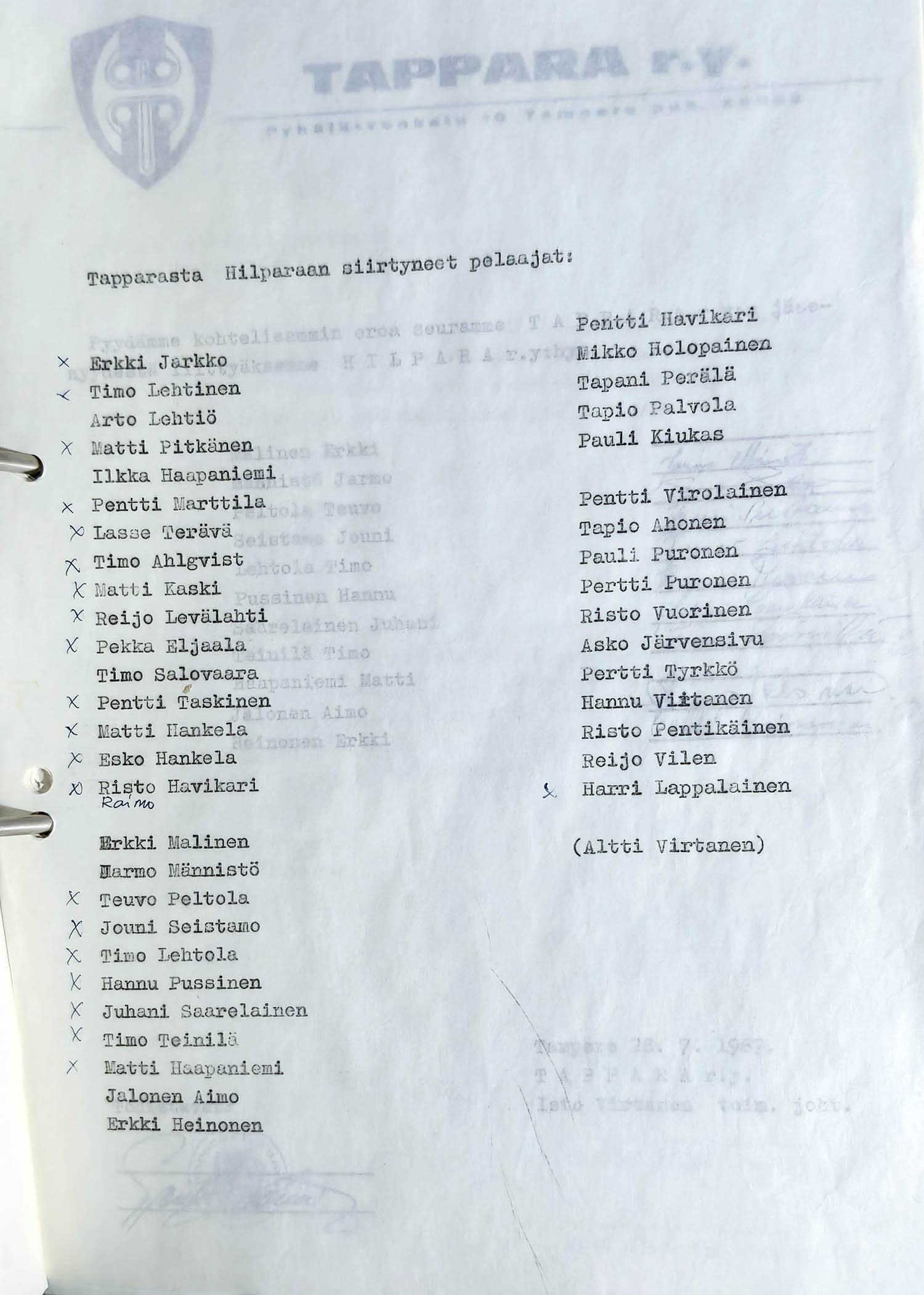 Viereisen listan pelaajat siirrettiin Tapparan kakkosjoukkueen alaisuudesta Hilparan riveihin heti heinäkuussa 1967, kun uusi seura oli rekisteröity. Listasta puuttuu vielä muutama nimi, joiden peliluvan saamista Hilparaan anottiin Jääkiekkoliitolta erikseen myöhemmin.