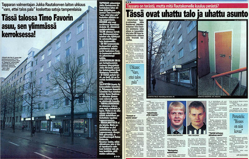 Ainakin näennäisen tosissaan ja vakavissaan lehtijuttu kirjoitti niin kuin Rautakorpi todella olisi ollut todella polttamassa Favorinin taloa, mutta ei uhkausta tehdessään tiennyt, että tämä asuukin kerrostalossa, jossa asuu paljon muitakin ihmisiä. ”Mahdollista murhapolttoa ei ole helppo rajata yhteen asuntoon, ja kerrostalon ylimmissä kerroksissa ulkopuolisten vaara moninkertaistuu”, toimittaja pisteli menemään ylilyöntikirjoituksessaan.