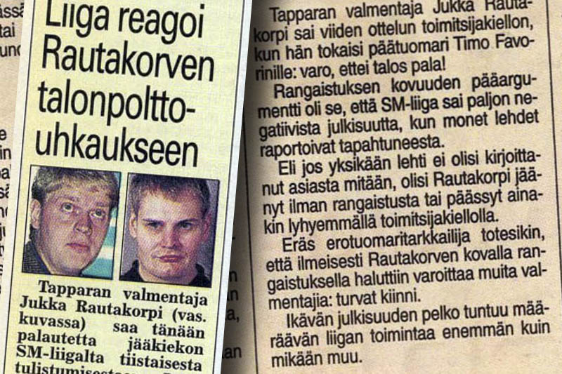 Urheilumedia tykkää värikkäistä persoonista ja rakastaa räväköitä lausuntoja. Joskus medialle ei kuitenkaan riitä se, mitä sanotaan ja tarkoitetaan, vaan se vääntää pahassa tarkoituksessa asiat vielä enemmän kohua aiheuttavaan eli myyvempään muotoon. Sen sai huomata Tappara-valmentaja Jukka Rautakorpi syksyllä 1999 Lappeenrannassa, kun hänen kuumapäissään heittämänsä varomattomat sanat eivät menneetkään yhdestä korvasta sisään ja toisesta ulos ja unohtuneet minuutissa niin kuin niiden olisi pitänyt, vaan jäivät seuraamaan häntä koko loppu-uran ajaksi.